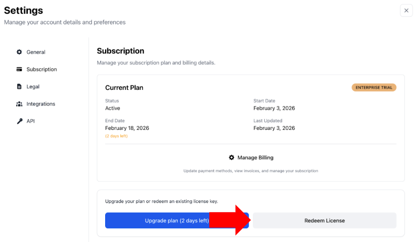 How to redeem: Go to User -> Settings -> Subscription -> Redeem License -> Enter code and Activate License.