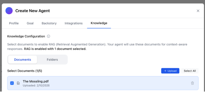 - You will see the document added to your agent's knowledge and automatically selected!